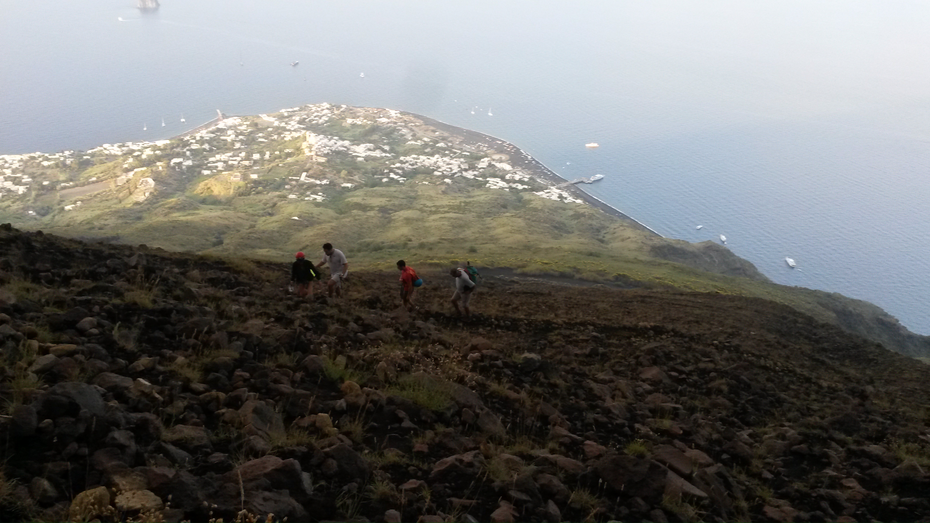 Ein herrlicher und beeindruckender Ausflug, auch wenn uns die 950 Höhenmeter alles abverlangten.Dazu aus Mircos Tagebuch:„Die Anfahrt auf den Vulkan, und seine langsam aus dem Dunst herausschälende Siluette mit der hoch über dem Krater stehenden Wolke waren beeindruckend. Eindruck hatte aber auch der Schwell hinterlassen der unentwegt von Backbord unter der Wimar durchlief. Die Badepause mitten auf dem Meer in fast 1000 Meter tiefem und dunkelblauem Wasser war die beste Idee des Tages, hat mir aber auch Ruck-Zuck und nachhaltig die Rückseite verbruzzelt… . Der stille Abend im Cockpit vor der malerischen Kulisse des Vulkans hatte aber für die sich ewig lang ziehende Anfahrt mehr als entschädigt. Als der Rest der Crew wieder an Bord kam, hatte sie zum Dank den halben Vulkan mitgebracht der sich noch einige Tage an Bord verteilte.“